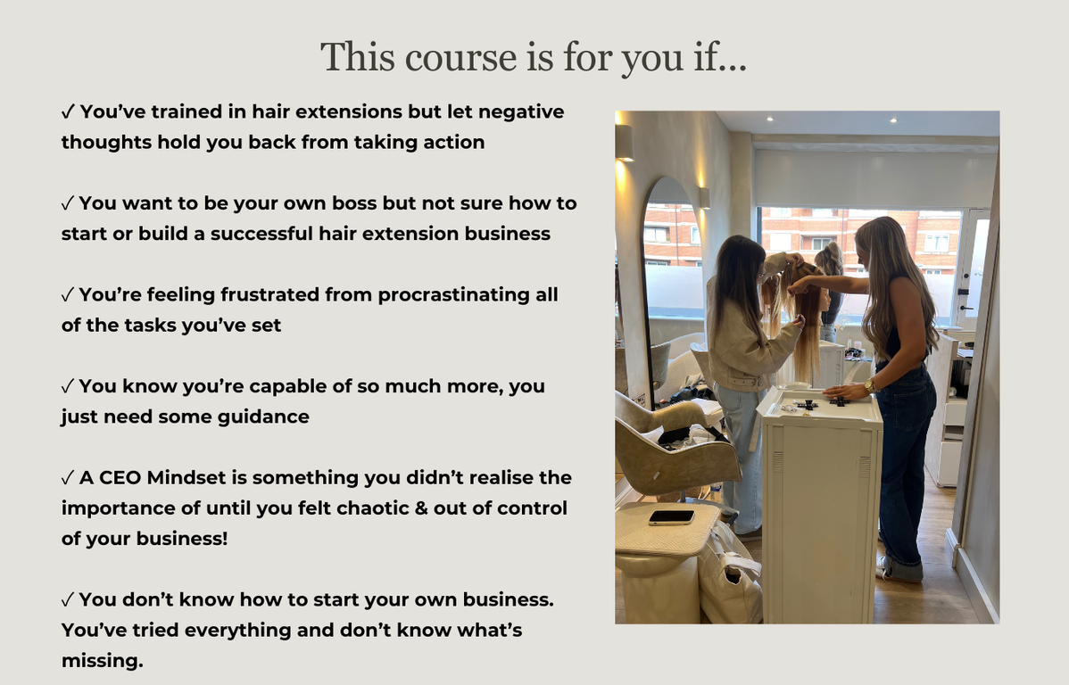 Hi there! I'm a passionate entrepreneur and educator dedicated to guiding others towards their own success. With coming into the hair extension industry with ZERO previous experience, I know how overwhelming it can be, which is why I have created this course for you to not only master your skill, but also give you invaluable information on how to grow your business.