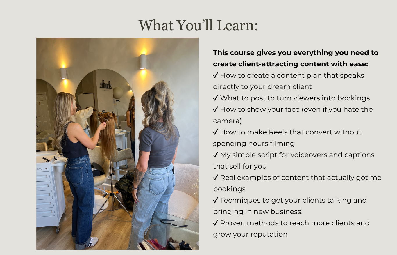 🏆 I currently own a thriving 6 Figure salon, training academy PLUS have clients & students globally! I've been able to achieve this within only 5 years of being in the industry, because of this exact strategy I teach you in this course.