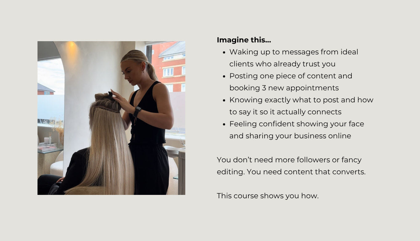 Hi there! I'm a passionate entrepreneur and educator, dedicated to guiding others towards their own success. With coming into the hair extension industry with ZERO previous experience, I know how overwhelming it can be, which is why I have created this course, because it's one thing being able to master your skill, but without knowing how to actually get clients in your chair, you will not get very far!